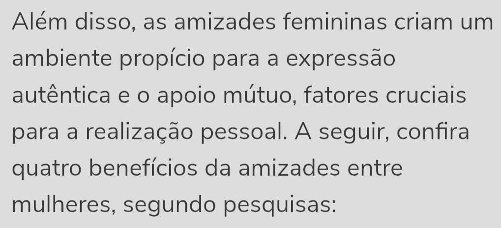 Manter amizades verdadeiras na vida adulta pode ser desafiador, mas é essencial para o bem-estar e a saúde mental das mulheres.Um estudo publicado pela Forbes mostra que mulheres com laços sociais fortes têm níveis mais baixos de estresse e maior satisfação com a vida. Veja abaixo: